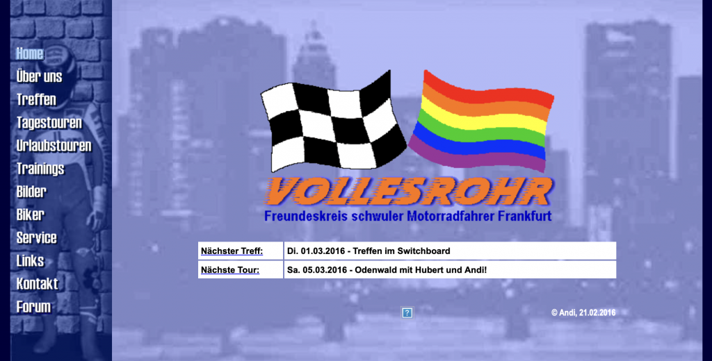 VOLLESROHR bietet schwulen Motorradfahrern aus dem Rhein-Main-Gebiet die Möglichkeit, mit oder ohne Mitgliedschaft im Verein, andere Motorradfahrer kennenzulernen, zu treffen und gemeinsam Touren zu fahren.